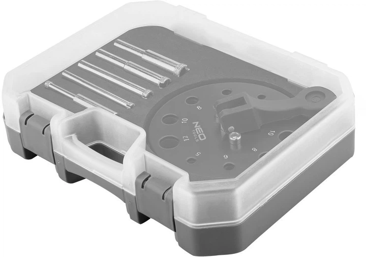 Wiertło diamentowe 5-12 mm z wiertłem, zestaw 6 sztuk marki Neo Tools zawiera wiertło diamentowe o średnicach 5, 6, 8, 10 i 12 mm oraz wiertło wyposażone w 10 kalibrowanych otworów w tych rozmiarach (2x5, 2x6, 2x8, 2x10, 2x12 mm). Zapewniają precyzyjne centrowanie i stabilną pracę narzędzia na gładkich powierzchniach. Nasyp diamentowy zapinania czystego skrawania materiałów chrupkich i ogranicza przegrzewanie i pylenie, podnosząc żywotność wiertła. Zestaw Neo Tools pozwala na wykonanie otworów do 35 mm globłości przy maks. prędkości obrotowej 2500 obr./min. Sprawdź go w marmurze, ceramice, kamionce i szkle. Zestaw składa się z 6 elementów (5 wierteł + prowadnica), tworząc mobilny, kompatybilny system do precyzyjnych przebić i montażu na płytkach i panelach szklanych.
