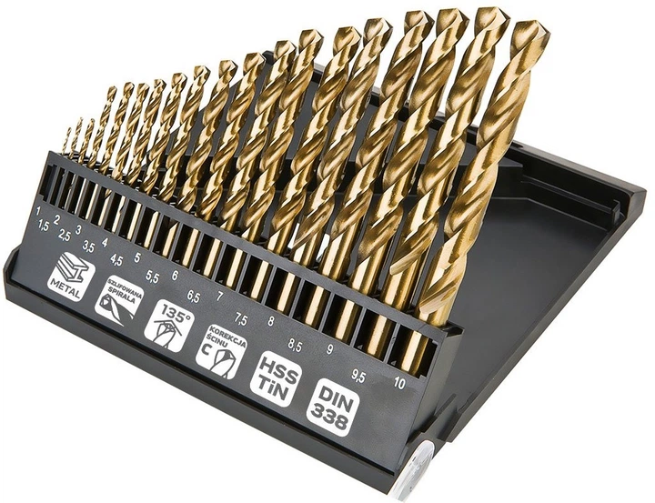 Wiertła do metalu HSS-TiN 1-10 mm, zestaw 19 sztuk 57-199 marki Neo Tools do wierteł głęboko wiercących zgodnie z normą DIN 338, wykonane ze stali 9341; posiadają kąt górny 135° z korekcją typu C oraz cylindryczny uchwyt ułatwiający nawiercanie bez punctowania. Dodatkowa powłoka z dwutlenku tytanu (TiN) zmniejsza opory skrawania i pomaga utrzymać wysoką jakość otworów – szczególnie podczas pracy na stojakach stolarskich. Długość części wrocęcej wyniso 1:12 mm, 1.5:18 mm, 2:24 mm, 2.5:30 mm, 3:33 mm, 3.5:39 mm, 4:43 mm, 4.5:47 mm, 5:52 mm, 5.5:57 mm, 6:57 mm, 6.5:63 mm, 7:69 mm, 7.5:69 mm, 8:75 mm, 8.5:75 mm, 9:81 mm, 9.5:81 mm, 10:87 mm, łącznie do 1:34 mm, 1.5:40 mm, 2:49 mm, 2.5:57 mm, 3:61 mm, 3.5:70 mm, 4:75 mm, 4.5:80 mm, 5:86 mm, 5.5:93 mm, 6:93 mm, 6.5:101 mm, 7:109 mm, 7.5:109 mm, 8:117 mm, 8.5:117 mm, 9:125 mm, 9.5:125 mm, 10:133 mm; natomiast zalekany zakres prędkości obrotowej dla metalu do 1:1900-3800 obr/min, 1.5:2550-3800 obr/min, 2:3650-4000 obr/min, 2.5:2900-3200 obr/min, 3:2450-2650 obr/min, 3.5:2100-2300 obr/min, 4:1850-2000 obr/min, 4.5:1650-1800 obr/min, 5:1450-1600 obr/min, 5.5:1350-1450 obr/min, 6:1200-1300 obr/min, 6.5:1150-1250 obr/min, 7:1050-1150 obr/min, 7.5:1000-1050 obr/min obroty na minutę, 8:900-1000 obr/min, 8.5:850-950 obr/min, 9:800-900 obr/min, 9.5:750-850 obr/min, 10:750-800 obr/min. Przeznaczeni wierteł od Neo Tools objemje stal, żelwo, metale nieżelazne (coed, aluminium, militar) oraz tworzywa sztuczne.