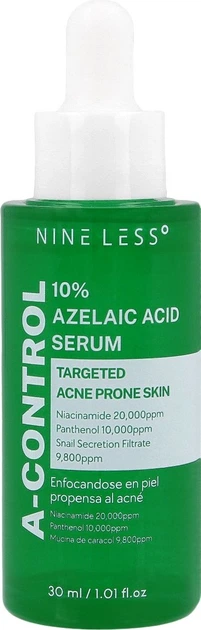 Корейська сироватка Nine Less A-Control 10% Azelaic Acid – це інтенсивний засіб, розроблений спеціально для тих, хто бореться з проблемами шкіри, такими як акне, зміна кольору шкіри та надмірне вироблення шкірного сала. Сироватка містить 10% азелаїнової кислоти, одного з найефективніших інгредієнтів у боротьбі з недосконалостями шкіри. Сироватка NINE LESS A-Control 10% Azelaic Acid – чудовий вибір для тих, хто шукає ефективний засіб для проблемної шкіри, боротьби з акне та зміною кольору шкіри. Завдяки високому вмісту азелаїнової кислоти, сироватка забезпечує комплексний догляд та покращує стан шкіри вже після кількох тижнів регулярного використання.
