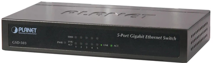 Przełącznik gigabitowy Planet GSD-503 do użytku domowego i w małym biurze jest wyposażony w pięć portów 10/100/1000 Mb/s z automatycznym wykrywaniem prędkości i ma kompaktową obudowę, która pozwala na ustawienie przełącznika na biurku lub przymocowanie go do ściany.