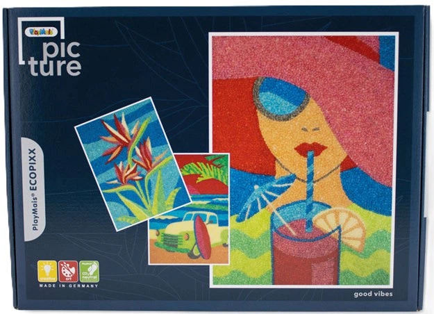 Playmais Picture Eсopixx – це новий та екологічний спосіб розслабитися за допомогою художніх творінь. Відкрийте для себе своє нове хобі з Playmais Picture Eсopixx, продуктом на основі відновлюваної сировини, який, завдяки вмісту натурального крохмалю, потребує лише невеликої кількості води для склеювання. Набір містить 3 шаблони для створення унікальних зображень, 2 зволожувальні губки, високоякісний пінцет для рукоділля та 9 кольорів Playmais Picture Eсopixx.