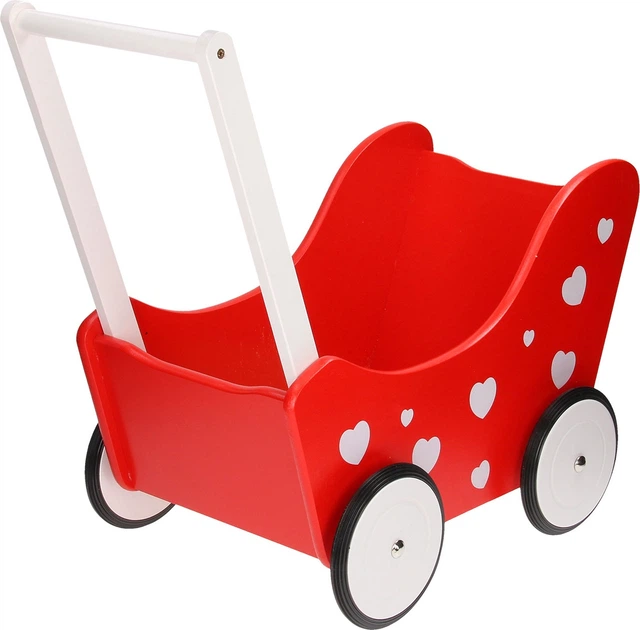 Міцна дерев'яна коляска для ляльок. Висота ручки 34 см. Шини гумові, що робить коляску для ляльок придатною для використання в приміщенні та не дряпає підлогу.