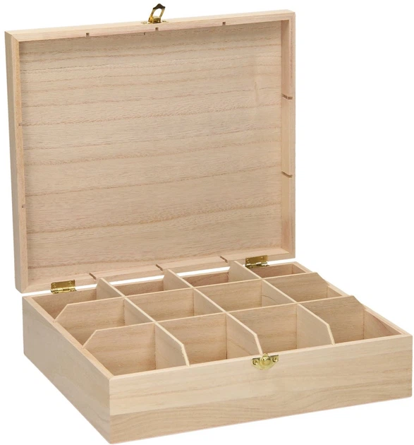 Ця дерев'яна чайна скринька має 12 відділень для зберігання ваших улюблених чаїв. Ви можете прикрасити скриньку на свій смак. Можна додати гарні блискітки або розмалювати її гарним візерунком. Чайна скринька закривається міцною засувкою.