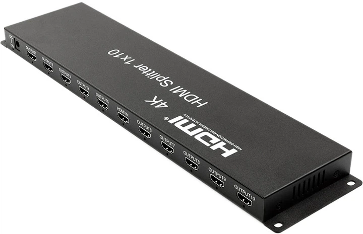 Цей перехідник HDMI 1x10 використовує один вхід HDMI та 10 виходів HDMI, це дає змогу легко розділити один пристрій (зображення) HDMI на десять сумісних з HDMI моніторів або проєкторів. Крім того, він може бути розміщений на кінці довгого кабелю HDMI для регенерації сигналу HDMI. Роздільна здатність цього HDMI-розгалужувача може бути до 3840x2160/30 Гц.
