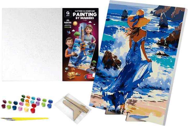 Zestaw do malowania po numerach dla przyszłego artysty. Każdy zestaw składa się z zagruntowanego płótna artystycznego na blejtramie, zestawu wysokiej jakości farb akrylowych w kolorach metalicznych, odpornych na ścieranie i blaknięcie, o pojemności 2,5 ml ± 9% każda, nylonowych pędzli o różnych rozmiarach, drewnianej podstawki i arkusza kontrolnego.