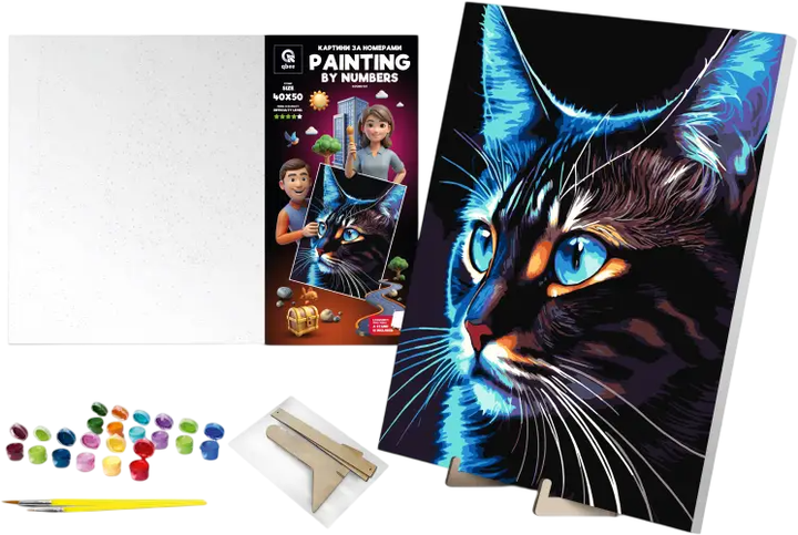 Każdy zestaw składa się z zagruntowanego płótna artystycznego na blejtramie, zestawu wysokiej jakości farb akrylowych w kolorach metalicznych, odpornych na ścieranie i blaknięcie, o pojemności 2,5 ml ± 9% każda, pędzli nylonowych o różnych rozmiarach, drewnianej podstawki i arkusza kontrolnego.