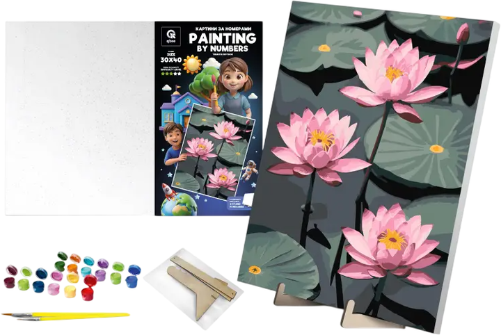 Zestaw do malowania po numerach qbee Delikatne lotosy z drewnianą podstawką 30x40 cm (900-063) - obraz 1