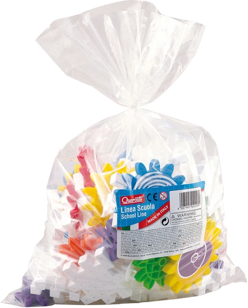 - Тип блоку: набір, найімовірніше, включає одну з флагманських систем Quercetti (наприклад, блоки Tecno з системою гвинтів та гайок або великі блоки Tubò). Враховуючи розмір XXL, це часто блоки геометричних форм, з отворами для з'єднання за допомогою шкантів, гвинтів або спеціальних з'єднувачів, що розвивають інженерні навички.