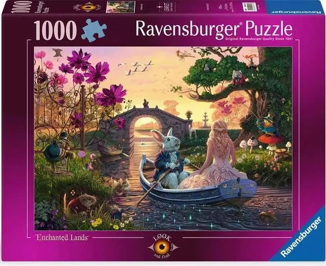 Ласкаво просимо до чарівної країни, повної надзвичайних істот та персонажів, деякі з яких натхненні відомими виданнями. Вам сподобаються сом (кіт з плавниками), зимородок (птах, який використовує вудку, щоб ловити свою здобич) та персонаж, що нагадує Ретті з казки Кеннета Грема «Вітер у вербах». Чи гребе Білий Кролик Льюїса Керролла на човні? А хто його прекрасна пасажирка? Картина пропонує кілька підказок щодо її особистості. Окрім цих фантастичних персонажів, чи зможете ви знайти 16 кроликів, «захованих» у цій сцені? Забудьте про свої повсякденні турботи та пориньте у світ чистої фантазії, склавши цей багато ілюстрований пазл. Набір містить листівку з додатковим зображенням пазла для зручності, ключ до картини та інформацію про художника.