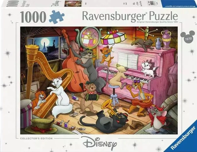 Приєднуйтесь до пригод аристократичної герцогині та її трьох чарівних кошенят — Тулузи, Марі та Берліоза — у їхній спробі повернутися додому в пазлі Disney «Аристокоти – колекційне видання» з 1000 елементів. Викрадені та покинуті у французькій сільській місцевості, герцогиня та її малюки отримують допомогу у своїй подорожі назад до Парижа від красномовного вуличного кота Томаса О'Меллі, його друга Скета Кота та його команди. Це ідеальний подарунок для шанувальника Disney або любителя котів — зрештою, кожен хоче бути котом.