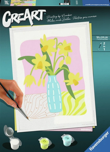 Класні візерунки, яскраві фарби та глянцевий лак забезпечують ідеальне завершення. Модний мотив нарцисів чудово підійде для дорослих та дітей віком від 12 років. Лінії мотиву вже надруковані та пронумеровані, їх просто потрібно розфарбувати готовими акриловими фарбами. Розвага та успіх гарантовані під час створення унікальних настінних прикрас. Малювати ще ніколи не було так просто!