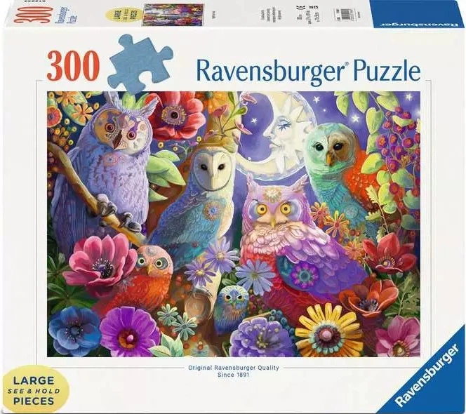 Дайте волю своїй уяві з цією чарівною зграєю сов, ідеально розташовуючись для спільного пазлу. Ця прекрасна, стилізована сцена зображує людину в місяці, яка освітлює ніч за допомогою вухатої сови, сипухи, пугача, сови, північної сови та чарівної крихітної сови-пилки. Квіти яскравих, насичених кольорів оточують всю деталь, що робить сортування деталей особливо приємним. Це розслаблююче проведення часу в поєднанні з високоякісними пазлами – хто знає, можливо, ви теж станете нічною совою.