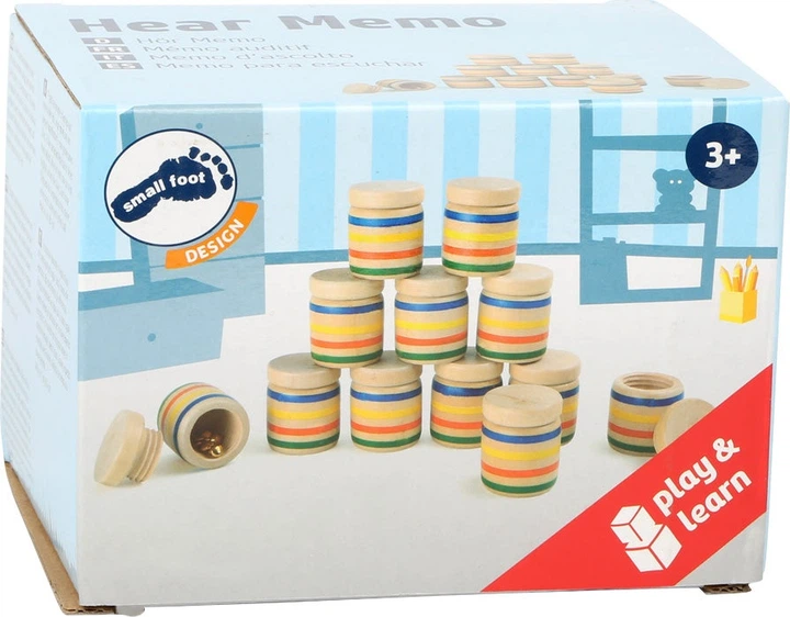 Дванадцять високоякісних дерев'яних скриньок, прикрашених різнокольоровими кільцями, вимагають особливого виду пам'яті! Кожна пара скриньок містить однакові предмети, які потрібно ідентифікувати, порівнюючи їхні звуки! Дерев'яне кільце звучить інакше, ніж дерев'яна кулька, рис звучить інакше, ніж маленькі дзвіночки, а маленькі камінчики звучать інакше, ніж крихітні скляні намистинки – чуєте різницю?