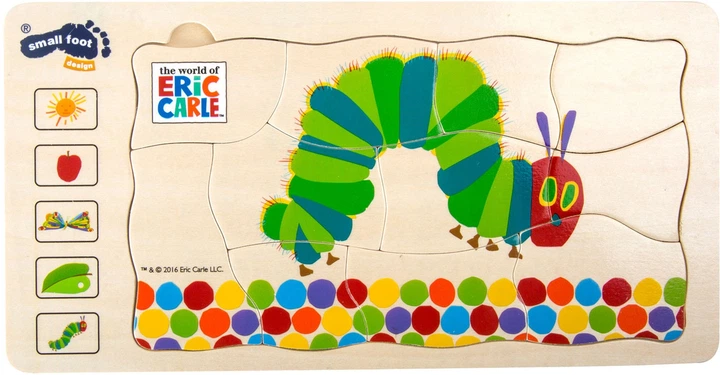 Ułóż elementy tej układanki i zobacz, jak pojawiają się najpiękniejsze obrazy Bardzo Głodnej Gąsienicy. Układanka składa się z kilku warstw, które pokazują, jak gąsienica przeobraża się w pięknego motyla. Układanka składa się z 36 drewnianych elementów i zachęca do rozwoju umiejętności rozpoznawania kształtów i kolorów, poznania natury oraz koordynacji wzrokowo-ruchowej.