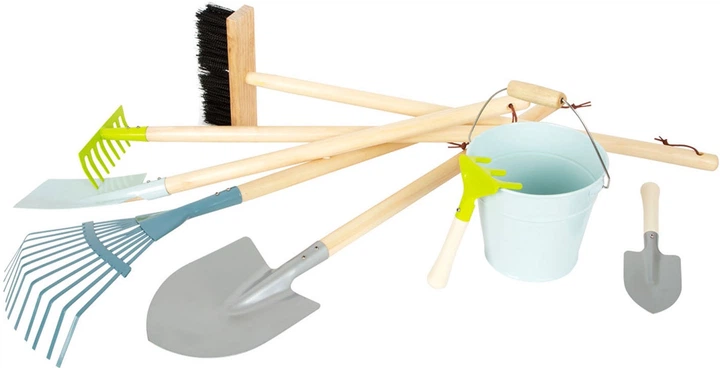 Дерев'яний набір садових інструментів для дітей, що складається з 8 елементів довжиною близько 80 см. Інструменти були розроблені спеціально для найменших, завдяки чому вони легкі, зручні у використанні та підходять для дитячих рук. Міцні дерев'яні ручки та міцні робочі елементи забезпечують довговічність та комфорт під час гри.