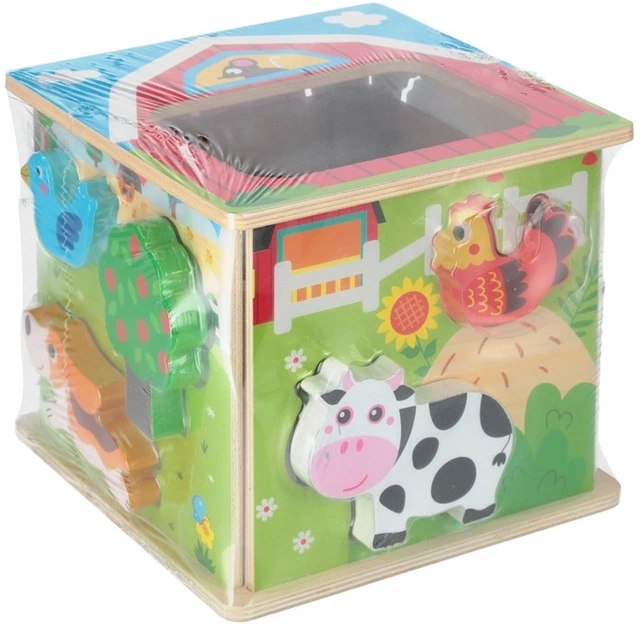 Цей барвистий дерев'яний кубик – ідеальна розвивальна іграшка для малюків віком від 18 місяців. Кожна сторона має отвори різної форми, а набір містить відповідні деталі у вигляді тварин та елементів сільського пейзажу, таких як корова, кінь, півень, дерево та будиночок.
