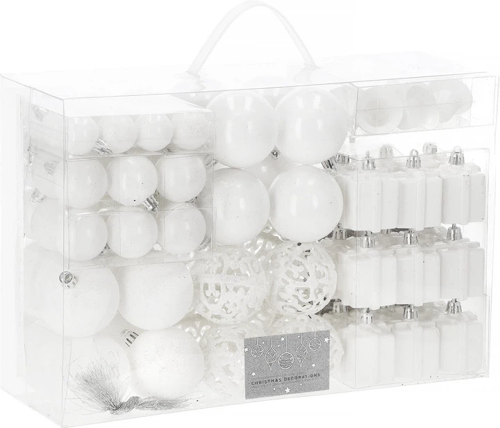 Перетворіть свою різдвяну ялинку на зимову казку! Цей вражаючий набір із 101 елемента білих прикрас – це квінтесенція елегантності та свіжості. Білий колір на різдвяній ялинці – це позачасовий тренд, який візуально збільшує ялинку, додає блиску інтер'єру та доповнює будь-яку кольорову гаму – від класичного зеленого до сучасного срібного чи золотого.