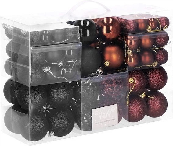 Відкрийте для себе нове визначення різдвяної розкоші. Цей унікальний набір кульок призначений для тих, хто хоче відмовитися від класичного червоного та золотого на користь сучасної вишуканості. Поєднання глибокого чорного, благородного коричневого та насиченого бордового створює кольорову палітру, яка випромінює престиж та спокій, ідеально поєднуючись з останніми тенденціями дизайну інтер'єру.