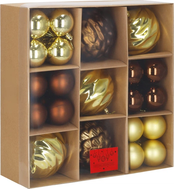 Відкрийте для себе магію свят абсолютно новим, вишуканим способом. Цей набір із 37 прикрас у відтінках благородного золота та насиченого коричневого ідеально підходить для тих, хто хоче створити інтер'єр, наповнений вишуканістю, спокоєм та розкішним теплом. Поєднання мерехтливого золота з землистим, приглушеним коричневим – це абсолютний хіт дизайну – воно надає ялинці надзвичайної глибини, нагадує природу та елегантність, залишаючись при цьому стриманим та сучасним.
