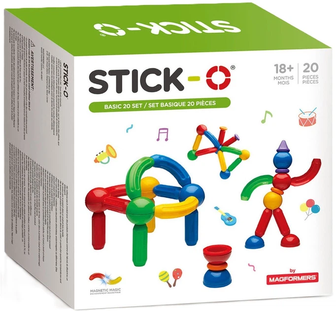 Stick-O Basic 20 – це чудовий набір із 6 різних деталей та загалом 20 будівельних блоків. Ваша дитина точно зможе відтворити милі фігурки, такі як качка, восьминіг, ракета... або відкрити їх разом з вами. Для дітей віком від 18 місяців Stick-O пропонує цю магнітну та розвиваючу конструктор. У комплекті є буклет із понад 30 барвистими та простими моделями. Ваша дитина здивує сама себе та насолодиться вашими компліментами! Stick-O можна комбінувати з подібними магнітними конструкторами.