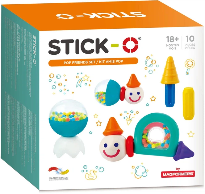 Відкрийте для себе магію цієї магнітної іграшки! Створіть власні шалені фігурки за допомогою Stick-O Pop Friends. З 10 деталей ви можете зібрати веселого гнома, брязкальце, ялинку тощо. Ці конструкції пробуджують творчість та уяву дітей віком від 1.5 років. Інструкція додається, але ніщо не заважає вам створювати власні витвори. Stick-O Pop Friends забезпечать години веселощів і їх можна поєднувати з подібними магнітними іграшками.