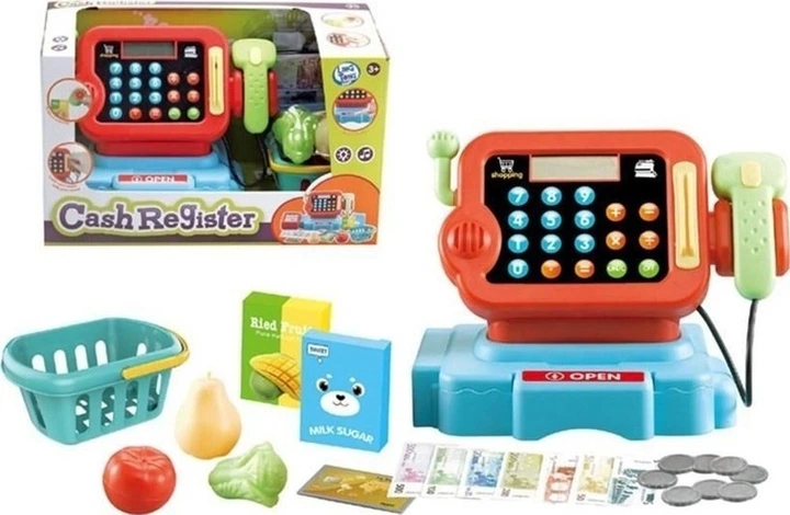 Набір включає касовий апарат з калькулятором, сканер, платіжну картку, кошик для покупок, овочі, фрукти та мініатюрну упаковку продуктів. Банкноти та монети також включені для полегшення ігрової гри в магазині.