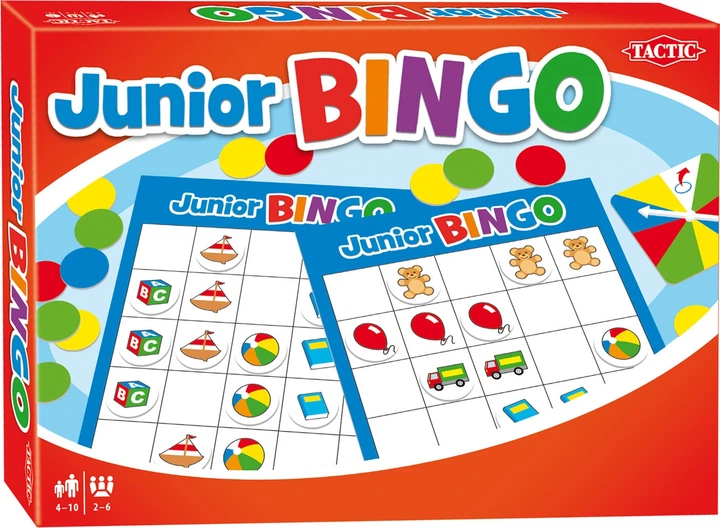 Грайте в захопливу та барвисту гру «Юніорське бінго» від Tactic. Обертайте стрілку та спробуйте якомога швидше вишикувати п'ять картинок на своїй картці для бінго. Перший гравець, який вигукне «Бінго», перемагає!