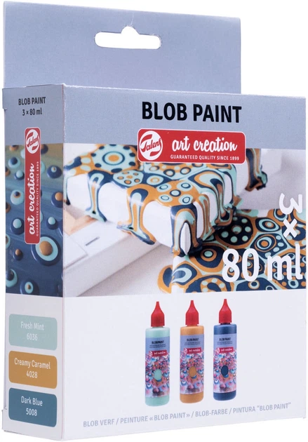 Talens Art Creation Blob – це готова до використання фарба, яка дозволяє створювати ідеально рівні крапки або цятки. Для найкращих результатів наносьте фарбу безпосередньо зі зручного дозатора на рівну поверхню. Немає потреби змішувати чи розбавляти фарбу, просто струсіть пляшку та починайте малювати! Склад: - 6036 Свіжа м'ята. - 4028 Вершкова карамель. - 5008 Темно-синій. Як використовувати: Створюйте барвисті ефекти, використовуючи різні техніки, такі як нашарування, де кожен шар сохне 24 години перед нанесенням наступного для тривимірного ефекту, або метод «мокрий по мокрому», щоб створювати візерунки різних кольорів, поки фарба ще волога. Ви також можете використовувати техніку заливання, рухаючи поверхню після нанесення фарби для цікавих ефектів крапель. Немає неправильного способу використання Blob, тож дайте волю своїй уяві!