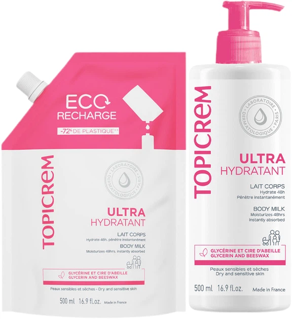 Topicrem Ultra Moisturizing Body Milk — 500 мл флакон з дозатором + змінний блок 500 мл.