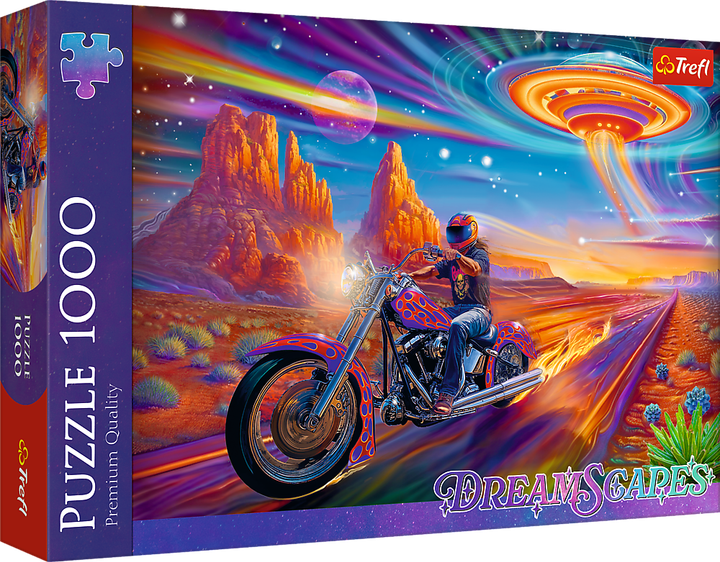 Пазл DreamScapes Дика їзда, що складається з 1000 деталей, зображує мотоцикліста, що мчить пустельним шосе, над яким нависає космічний корабель. При складанні вони утворюють картину розміром 68.3 x 48 см.