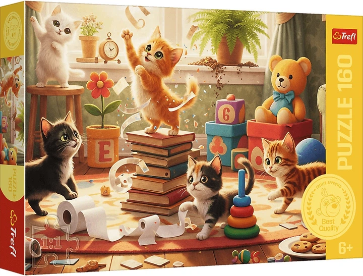 «Котячі пустощі» – це пазл із 160 елементів, який порадує юних любителів тварин. Після складання пазл створює зображення розміром 410 x 275 мм, що зображує маленьких кошенят, що граються. Висока якість, насиченість кольорів та безпечне складання забезпечуються каландрованим світловідбиваючим папером та використанням екологічно чистих матеріалів. Зображення було створено за допомогою Leonardo AI, авторське право © Trefl SA