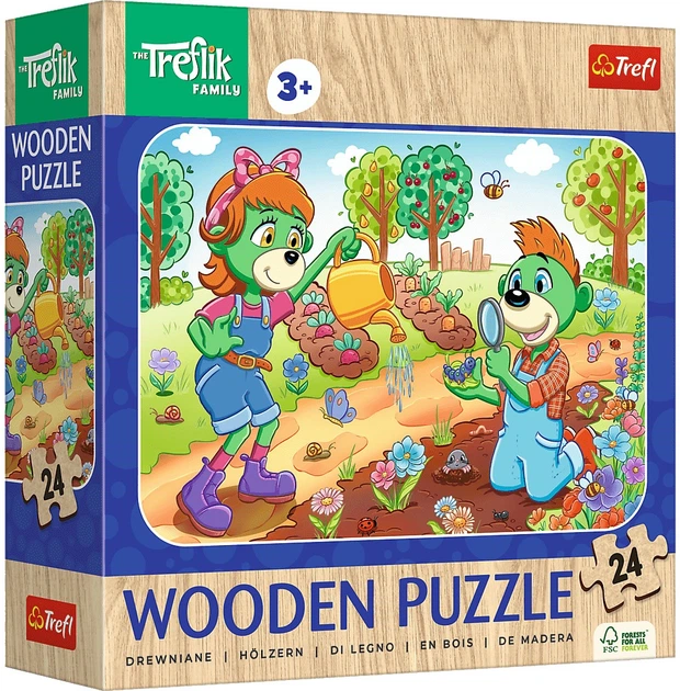 Дерев'яний пазл із 24 елементів – це пазл з натурального дерева, розроблений для найменших дітей. Закруглені краї, звичайні елементи та великий розмір роблять його ідеальним для дітей віком від 3 років, а декоративний мотив на звороті зробить розгадування пазла ще цікавішим для дітей! Пазл родини Трефлік перенесе дітей у світ казки родини Трефлік.