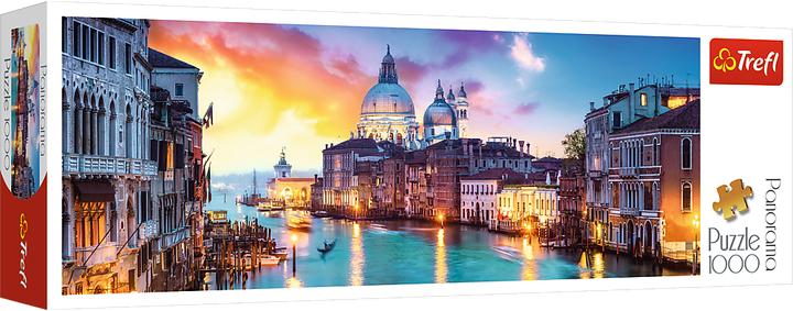 Панорамний пазл на 1000 елементів із зображенням венеціанського каналу Гранде. Після складання вийде картинка розміром 97x34 см. Високу якість, насиченість кольорів і безпеку складання забезпечує каландрований папір, що відбиває світло, покритий екологічними харчовими фарбами.