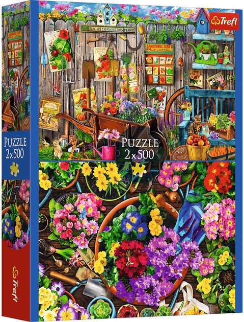 Пазл 2x500 – це два пазли по 500 елементів в одному наборі! «Садівництво» – це пазл із барвистою графікою, наповненою квітами та садовими аксесуарами, який порадує всіх любителів садівництва та не тільки. Кожен пазл створить картинку розміром 480 x 340 мм. Виріб виготовлено в Польщі з високоякісних матеріалів з урахуванням екологічно чистих матеріалів. Пазли покриті спеціальним каландрованим світловідбиваючим папером, що полегшує складання.