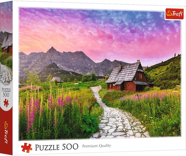 Цей пазл «Hala Gąsienicowa» у Татрах, що складається з 500 елементів, зображує мальовничу гірську долину з традиційною дерев'яною хатиною, оточеною квітучою рослинністю та величними татранськими вершинами на тлі барвистого неба під час заходу сонця. Після складання зображення має розмір 48 x 34 см. Висока якість, насиченість кольорів та безпечне складання забезпечуються каландрованим світловідбиваючим папером, покритим екологічно чистими харчовими фарбами.