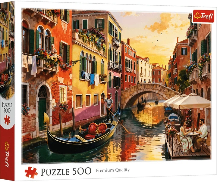 Цей пазл «Венеція на заході сонця» з 500 елементів зображує романтичну венеціанську вулицю на каналі, де гондоли пливуть у теплому світлі сонця, що заходить, серед барвистих таунхаусів та атмосферних столиків кафе. Після завершення отримане зображення має розмір 48 x 34 см. Висока якість, насиченість кольорів та безпечне складання забезпечуються каландрованим світловідбиваючим папером, покритим екологічно чистими харчовими фарбами. Зображення було створено за допомогою Leonardo AI, авторське право © Trefl SA