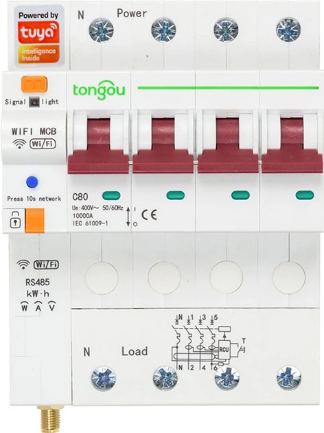 Розумний 4-полюсний перемикач для електроприладів, що підтримує дистанційне керування через Wi-Fi 2.4 ГГц, TuyaSmart або SmartLife; RS485; встановлюється на DIN-рейку; для різної побутової техніки. У комплекті 2 антени Wi-Fi. З урахуванням енергоспоживання.