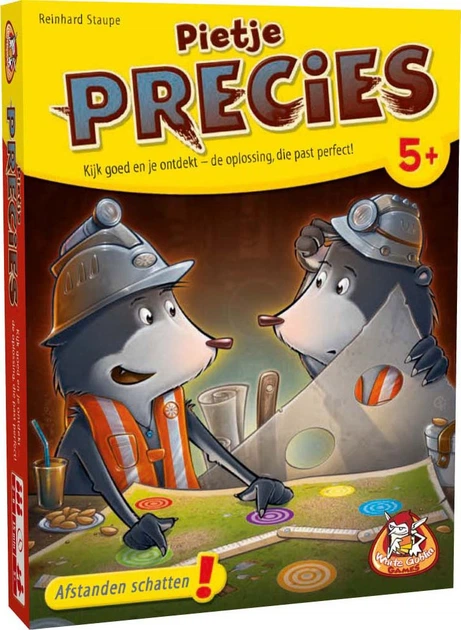 У грі «Pietje Precies» («Точний Піт») ви намагаєтеся знайти таку ж відстань між двома отворами на одній дошці, як і між двома кольоровими колами на іншій дошці. Правила прості: візьміть дві дошки та покладіть одну лицьовою стороною догори, щоб побачити вісім кольорових кіл. Покладіть другу дошку лицьовою стороною догори, сантиметровою стрічкою догори. Визначте, які два кольорові кола на першій дошці знаходяться на такій самій відстані одне від одного, як і два отвори на другій дошці. Існує лише одне рішення, і ви можете оцінити відстань між колами лише на зір.