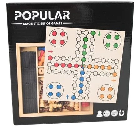 Ten praktyczny zestaw gier magnetycznych to świetna propozycja dla całej rodziny. W eleganckim drewnianym pudełku znajdują się wszystkie elementy potrzebne do rozgrywki w kilka klasycznych gier planszowych. Dzięki magnetycznym planszom i pionkom gra jest wygodna i stabilna – idealna zarówno do zabawy w domu, jak i w podróży.