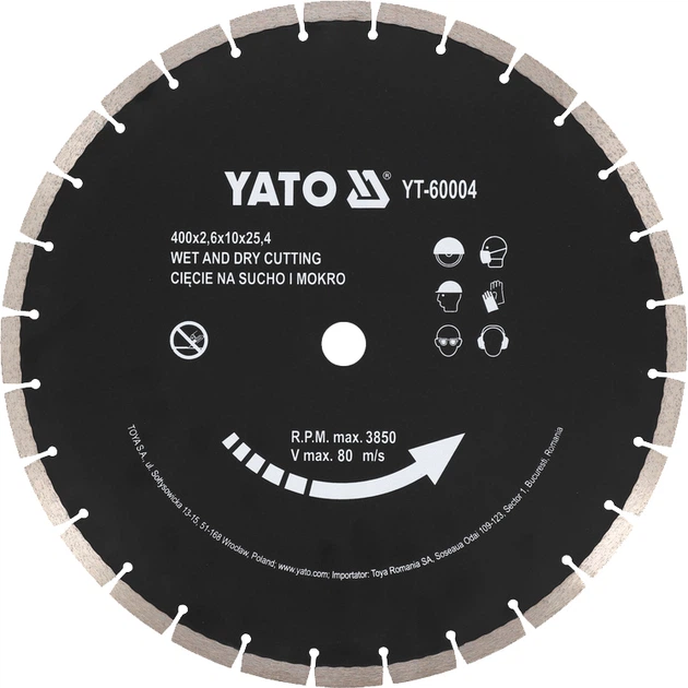 Tarcza diamentowa Yato YT-60004 do betonu cięcie na sucho i na mokro Ø 400 x 25.4 mm 3.6 mm (5906083072512). Diamentowe tarcze do betonu z segmentem spiekanym na gorąco zapewniają wysoką wytrzymałość.