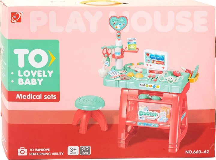 Dzięki temu 22-częściowemu stanowisku lekarskiemu masz wszystko, czego potrzebujesz, aby dokładnie zbadać swoją lalkę lub pluszaka! Usiądź na stołku i załóż okulary: badanie może się rozpocząć. Zmierz ciśnienie krwi lub osłuchaj bicie serca. Możesz również zbadać uszy pacjenta lub zmierzyć mu temperaturę. Czy diagnoza jest oczywista? W szafce znajdziesz różne leki przeciwbólowe, takie jak paracetamol lub krople do oczu.