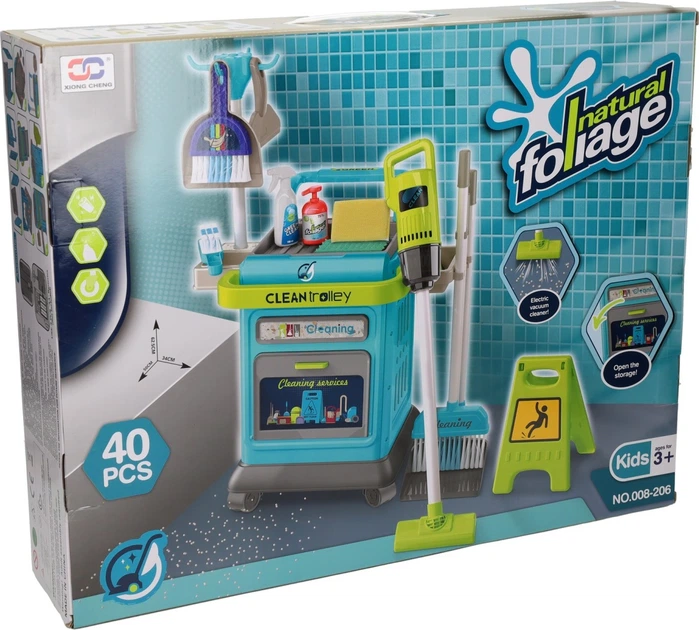 Zamień się w prawdziwego profesjonalistę sprzątania z tym wszechstronnym wózkiem do sprzątania! Wózek zawiera aż 40 elementów, od miotły, szufelki i szczotki, po działający odkurzacz i gąbkę! Teraz możesz pomagać w domu i sprzątać jak mama i tata!